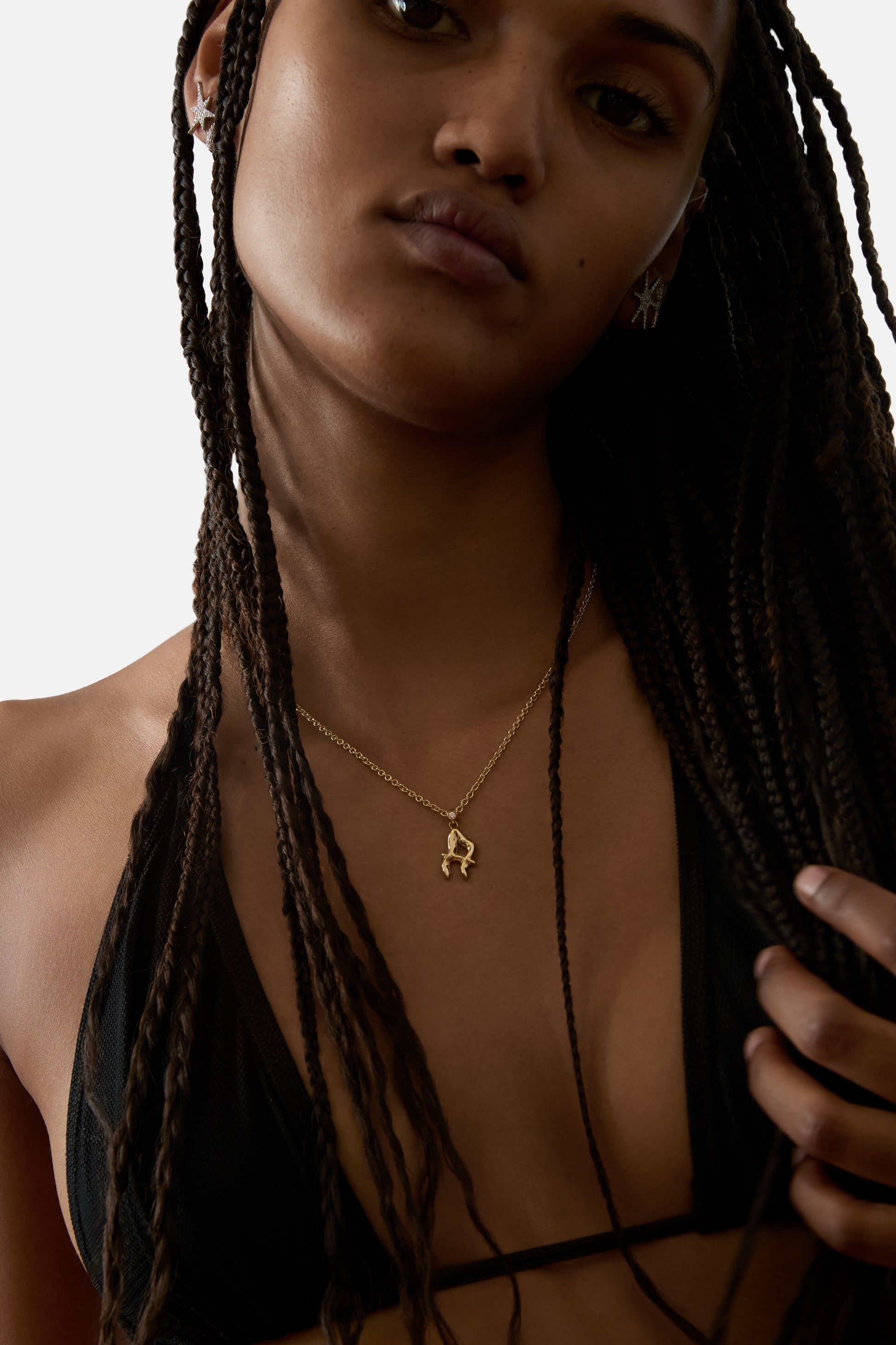 A jewelry essential, the letter pendant is reimagined through the vision of Lloyd Steven. Each letter is shaped with distinct curves and defined by a subtle ridge, creating detail and dimension.