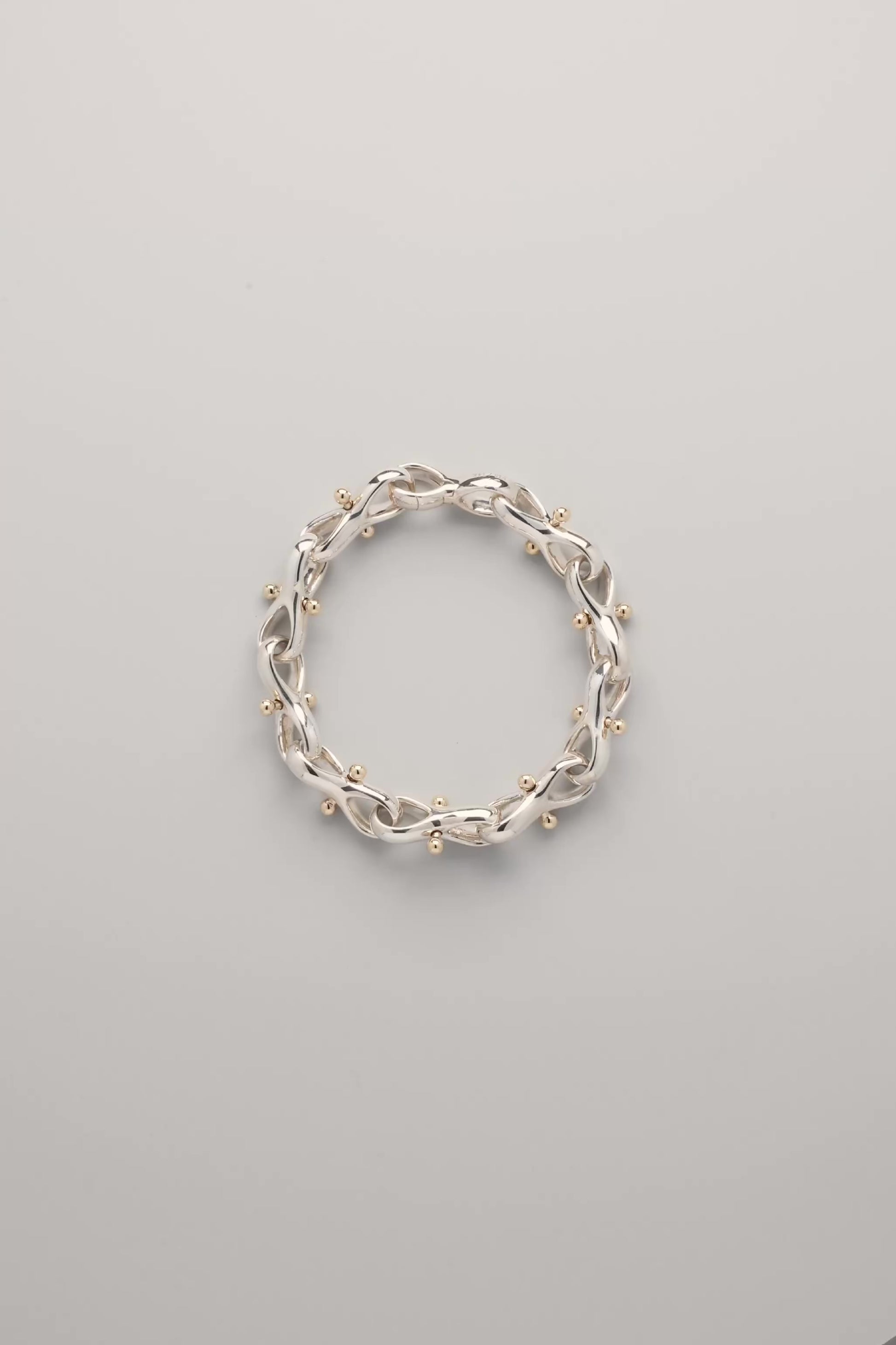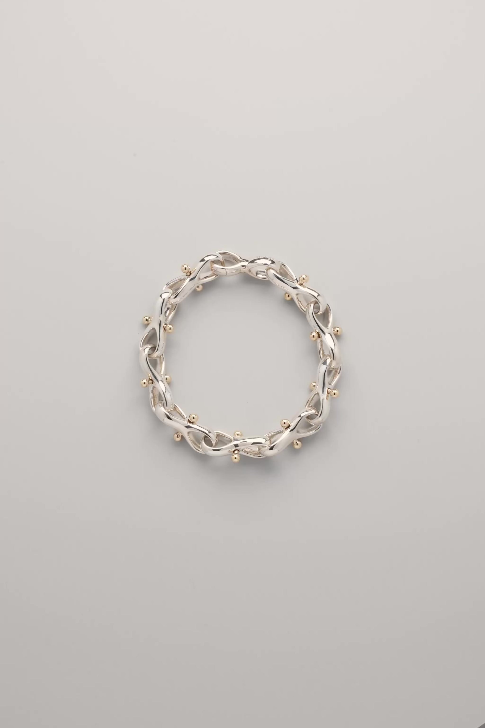 Sterling silver bracelet composed of interlocking figure-eight links. Each link is threaded with a solid 14k gold movable bar tipped with polished spheres, adding a subtle kinetic quality.