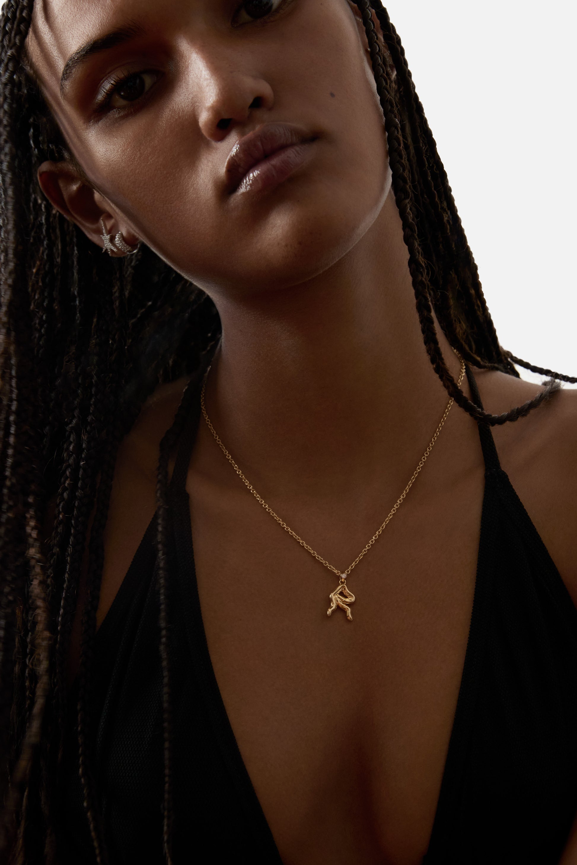 A jewelry essential, the letter pendant is reimagined through the vision of Lloyd Steven. Each letter is shaped with distinct curves and defined by a subtle ridge, creating detail and dimension.