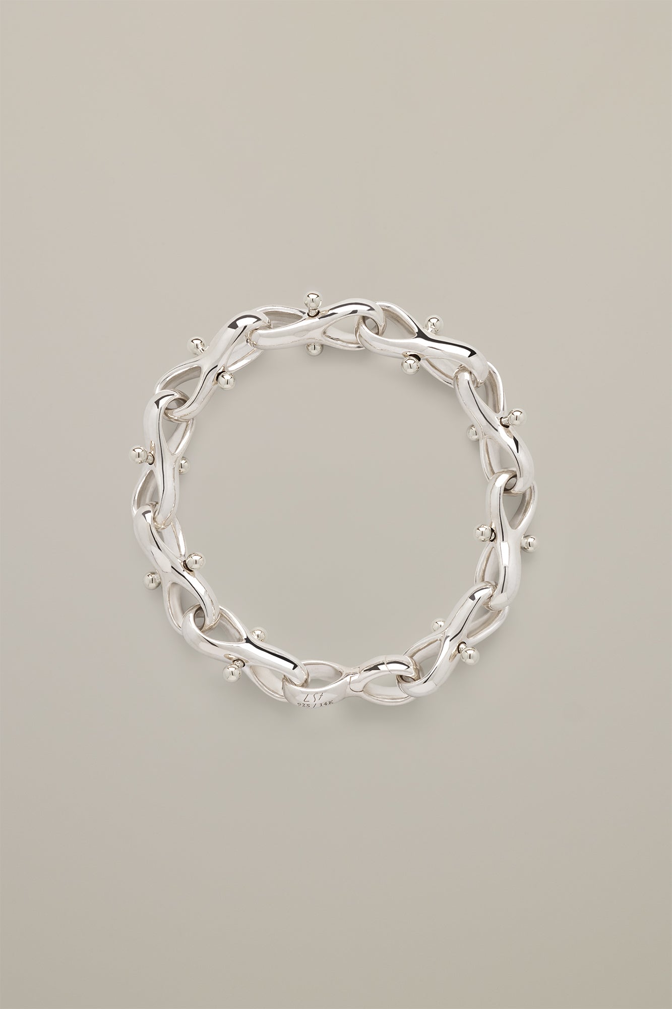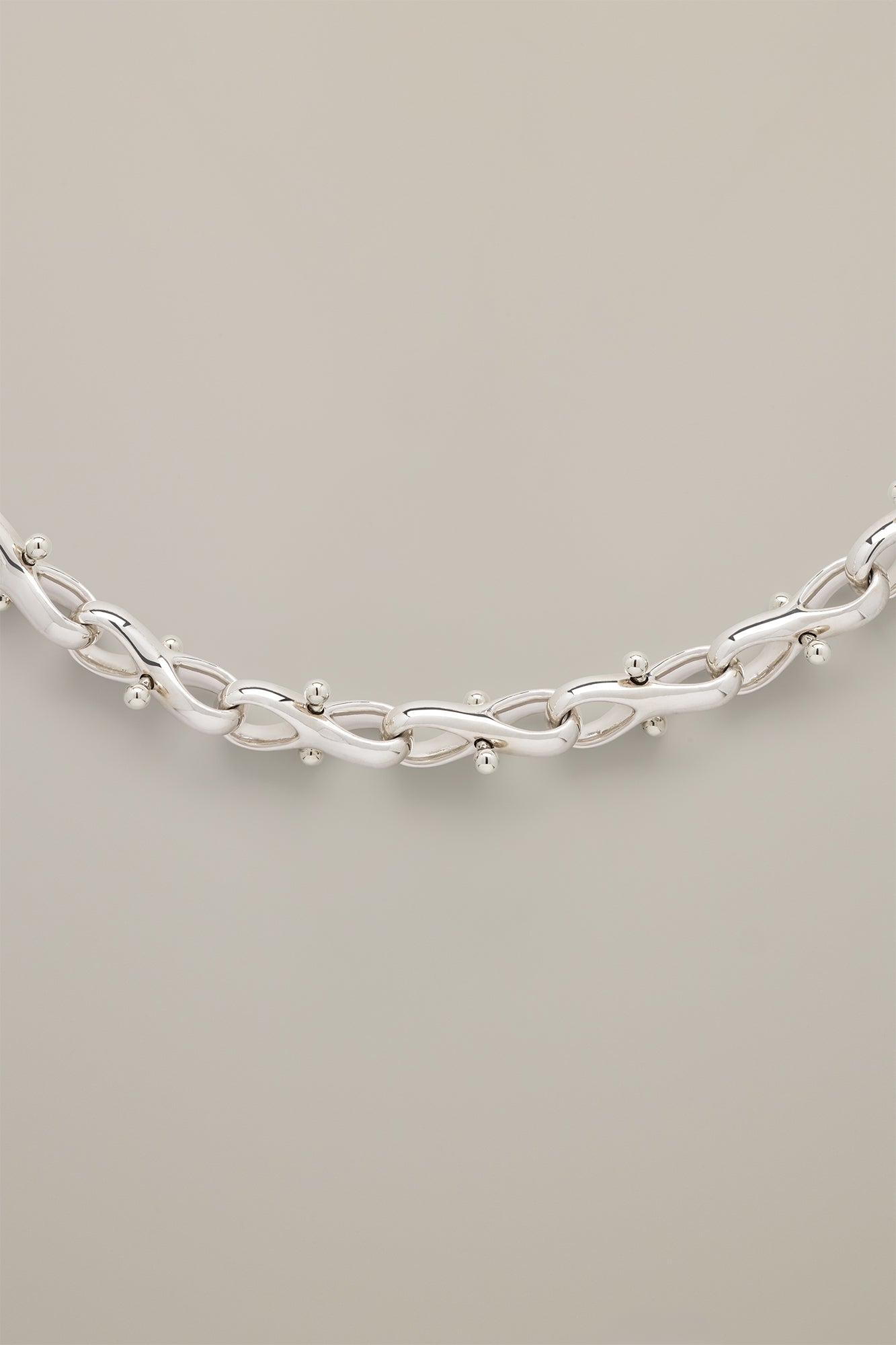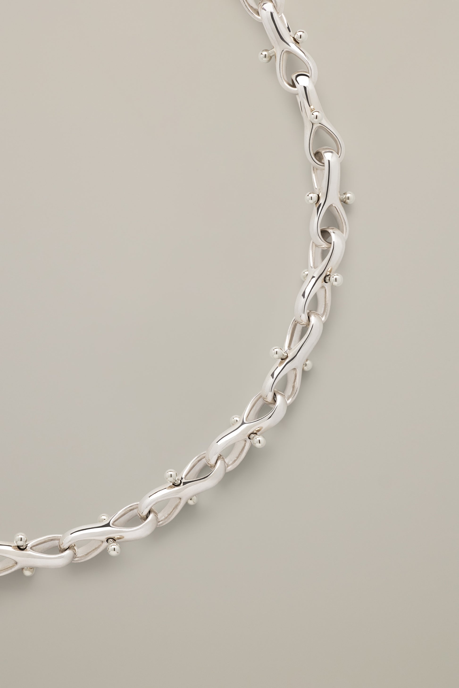 Sterling silver necklace composed of interlocking figure-eight links. Each link is threaded with a movable bar tipped with polished spheres, adding a subtle kinetic quality.