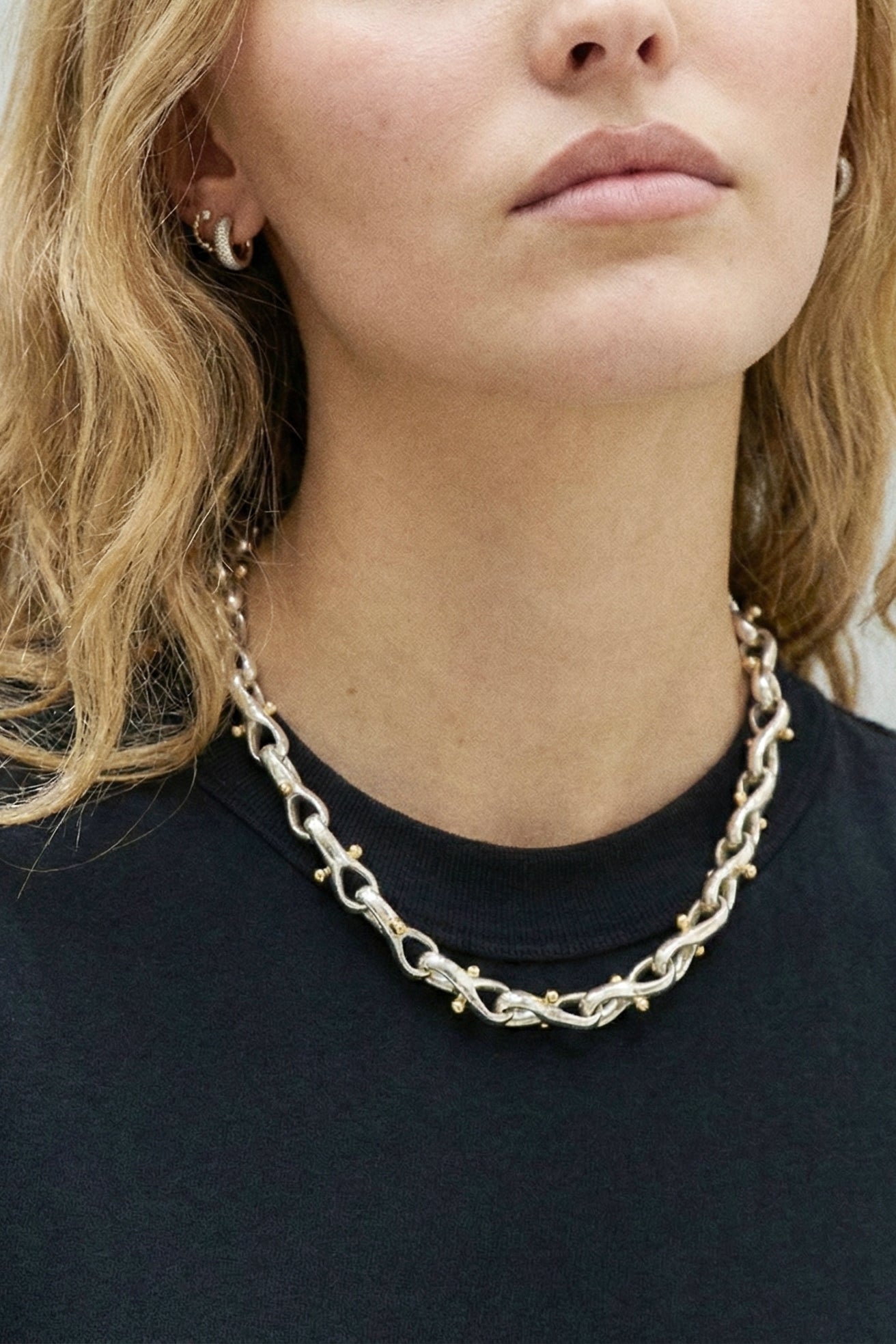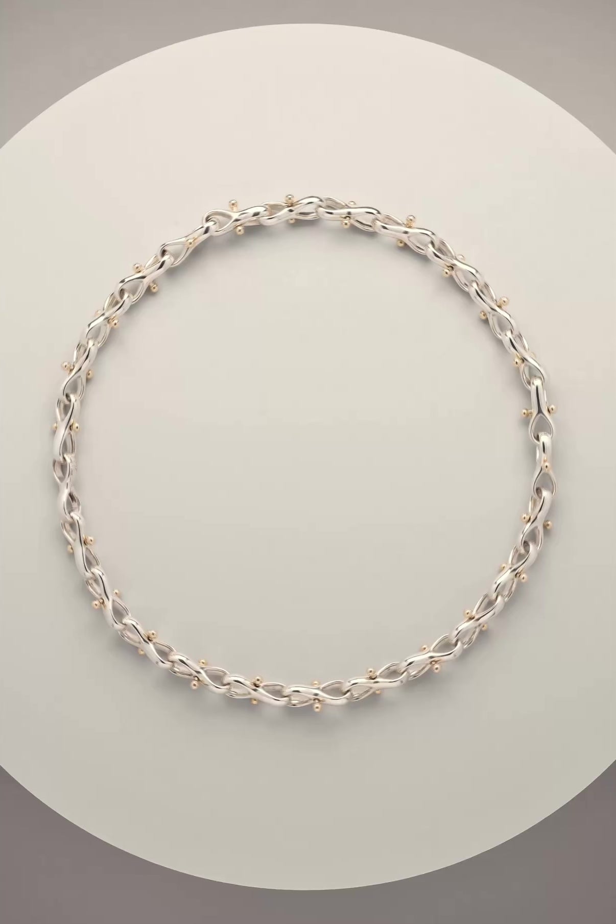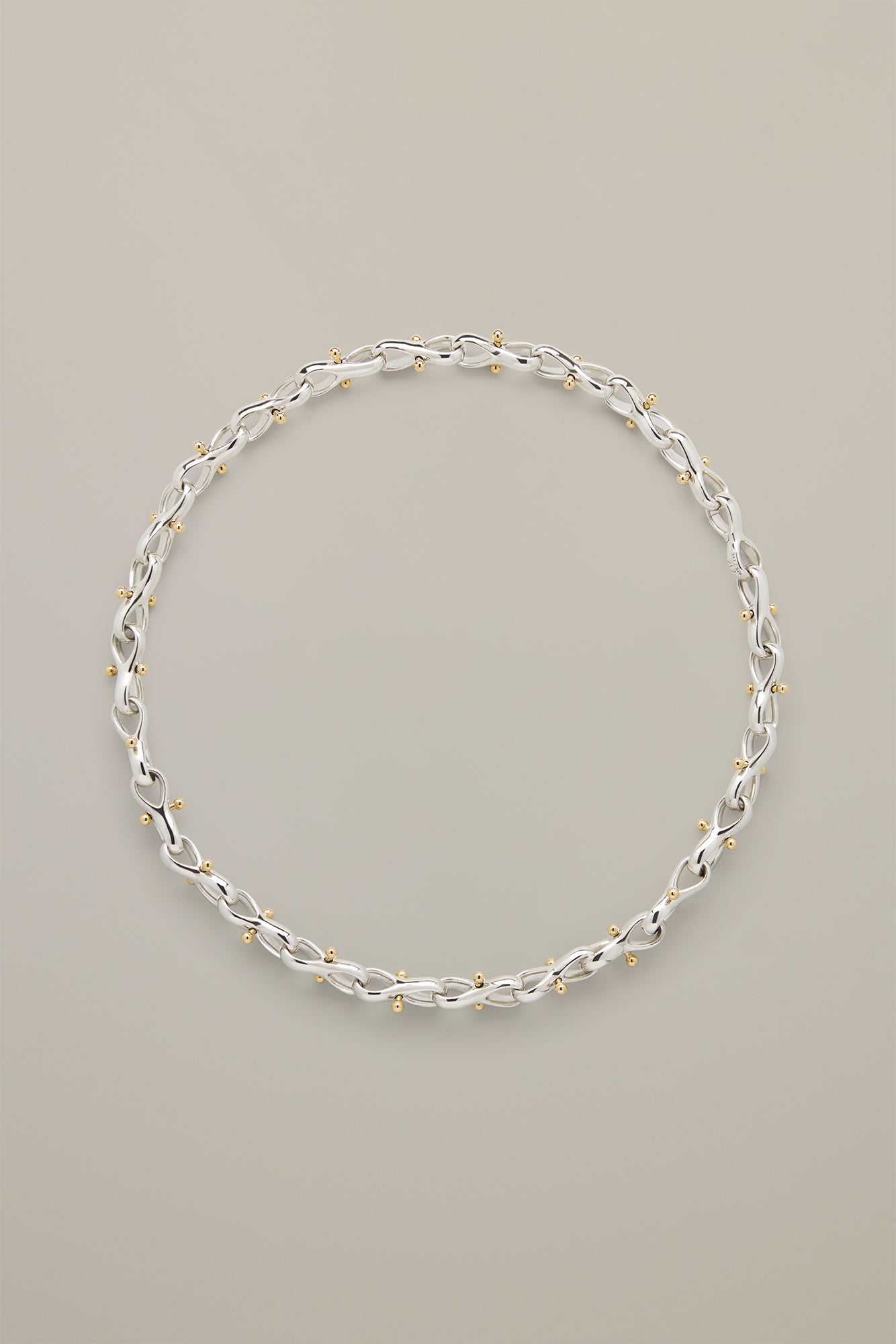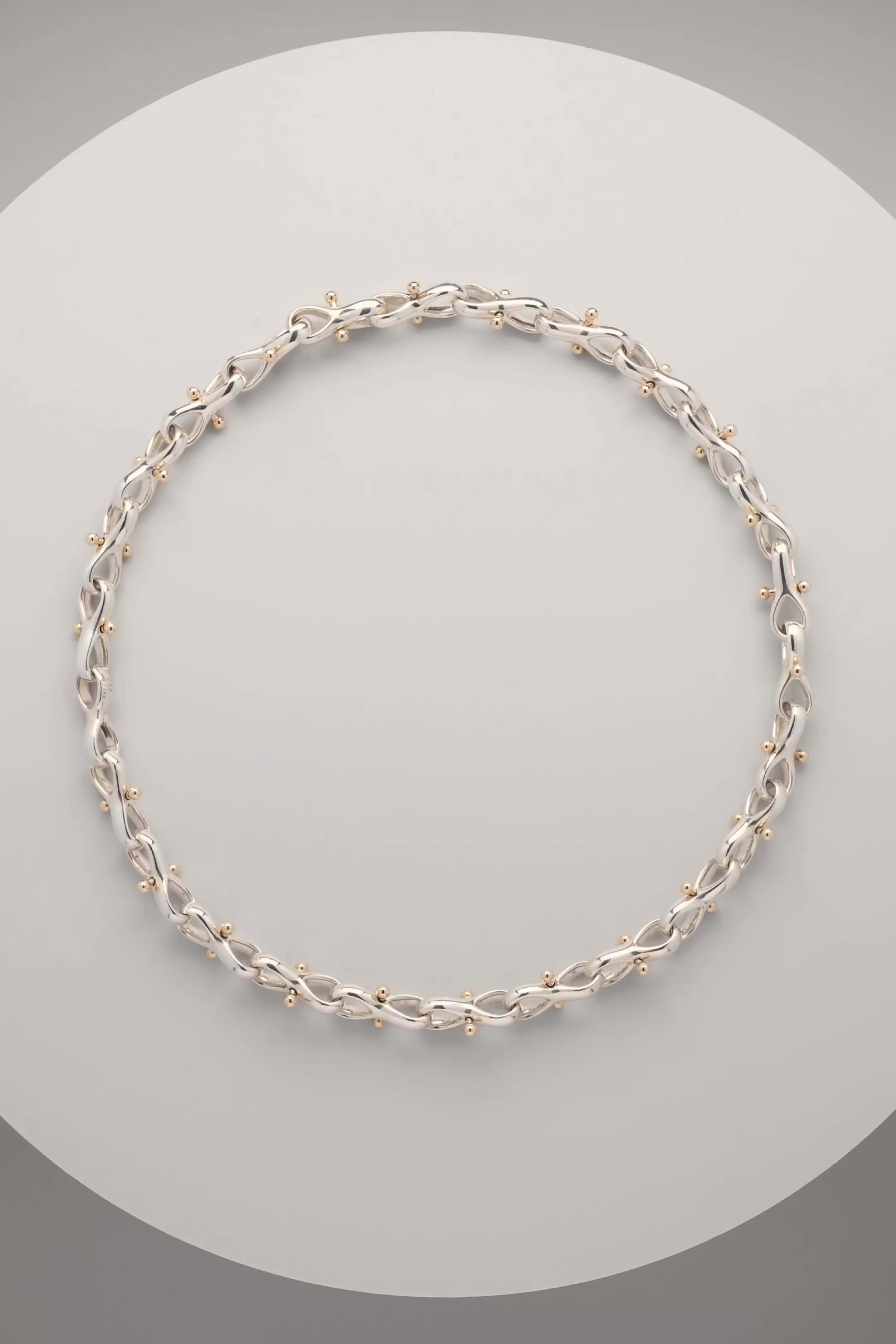 Sterling silver necklace composed of interlocking figure-eight links. Each link is threaded with a solid 14k gold movable bar tipped with polished spheres, adding a subtle kinetic quality.
