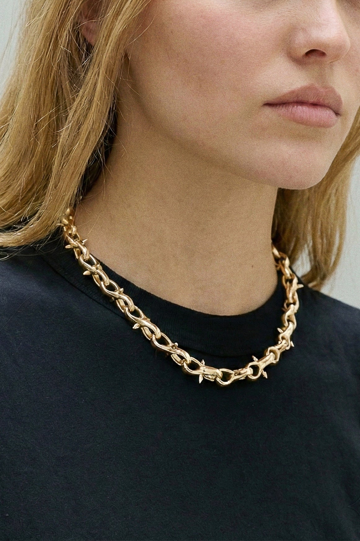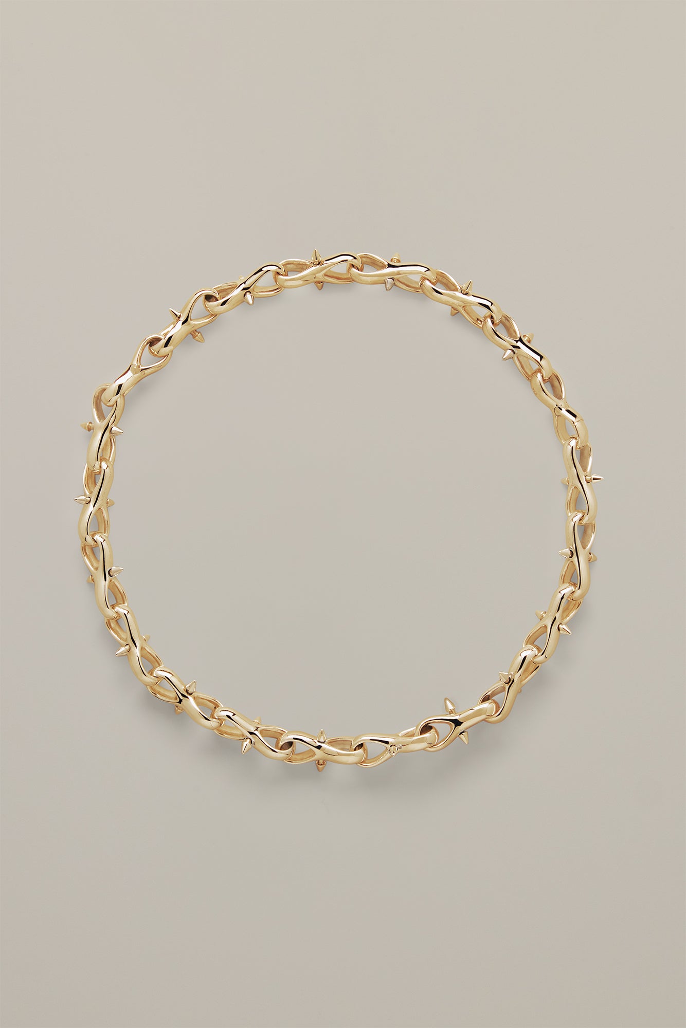 18k gold necklace composed of interlocking figure-eight links. Each link is threaded with a movable bar tipped with polished spikes, adding a subtle kinetic quality.