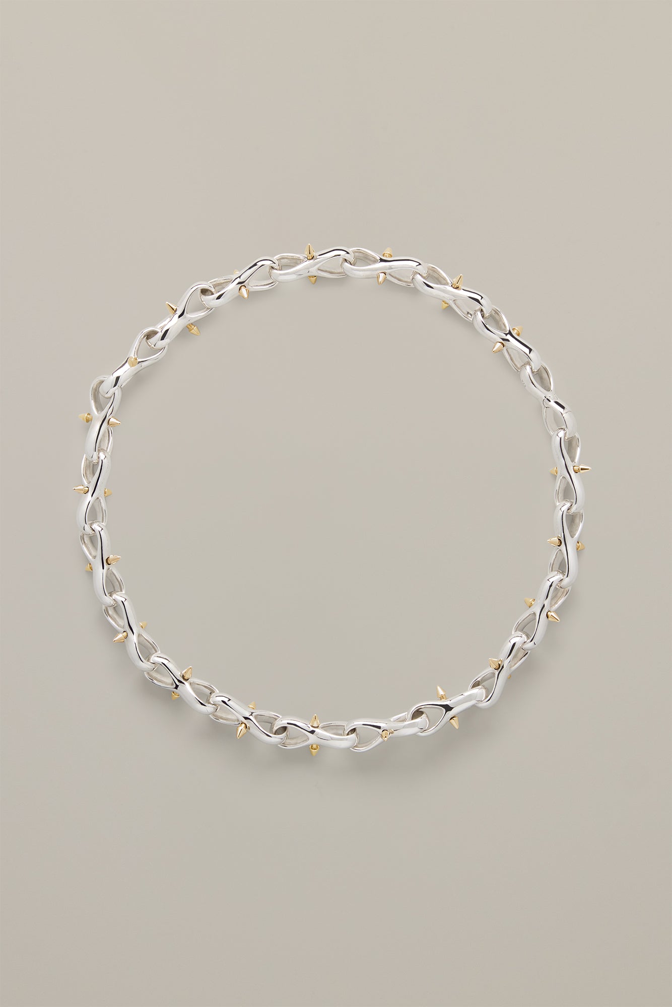 Sterling silver necklace composed of interlocking figure-eight links. Each link is threaded with a solid 14k gold movable bar tipped with polished spikes, adding a subtle kinetic quality.